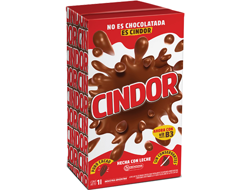 Cindor es una leche chocolatada riquísima, adicionada con vitaminas A, B3, D y ácido fólico. Además, aporta calcio, proteínas, vitaminas B2, B12 y es libre de gluten.